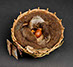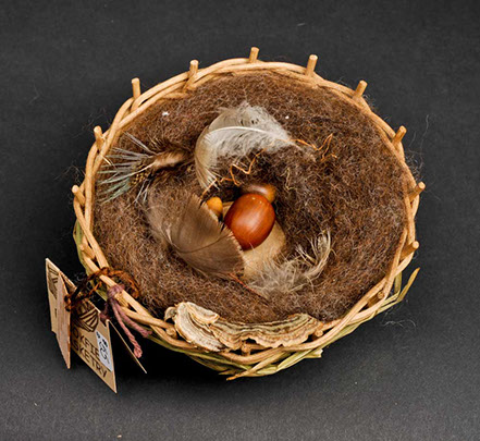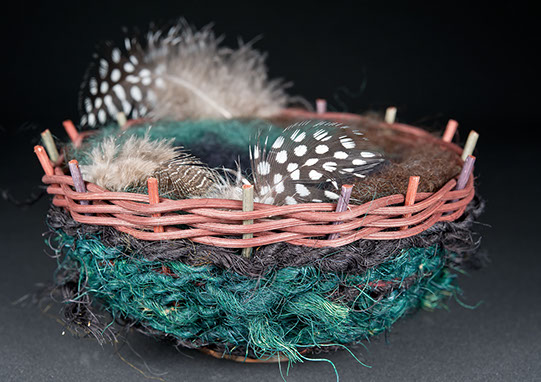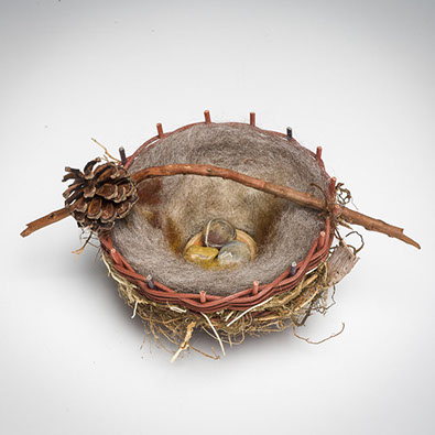The nests are very special to me, perhaps because so much of nature goes into them: grasses, fibers, and twigs from streams and beaches as well as lily, iris, and crocosmia leaves from the garden. I fill them with soft wool fiber and add little found treasures. Each nest is a small quiet unique expression.