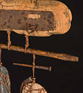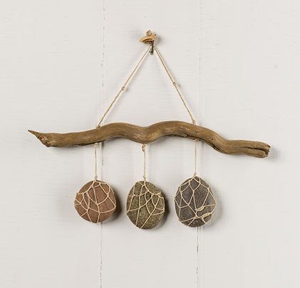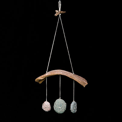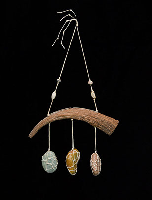 The basketry here began with a thought about combining stones I have collected with linen in an unusual way. The work evolved as I added other materials. I wondered if I could weave around a cairn. “Celebration” was the first – a stationary structure. I wondered then about a structure that might move – perhaps hanging from an interesting branch. Then I wondered what else I could add . . .